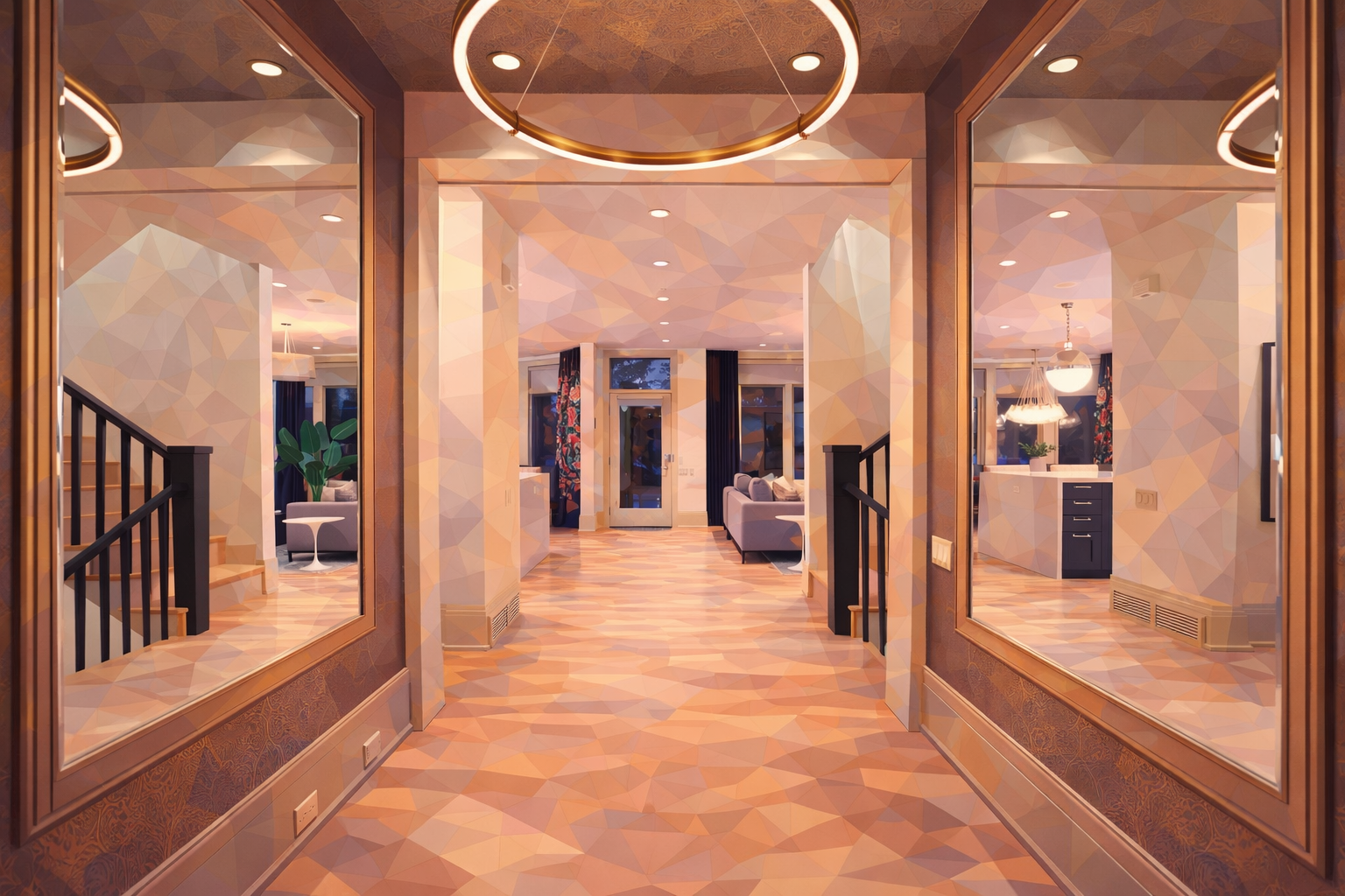 The grand entrance corridor announces what awaits with architectural authority. Symmetrical archways frame a vista that draws the eye through to sun-drenched living spaces beyond. Oversized mirrors in warm wood frames amplify the sense of arrival, while a circular brass-ringed chandelier hovers overhead—a sculptural statement that sets the tone for everything to follow.