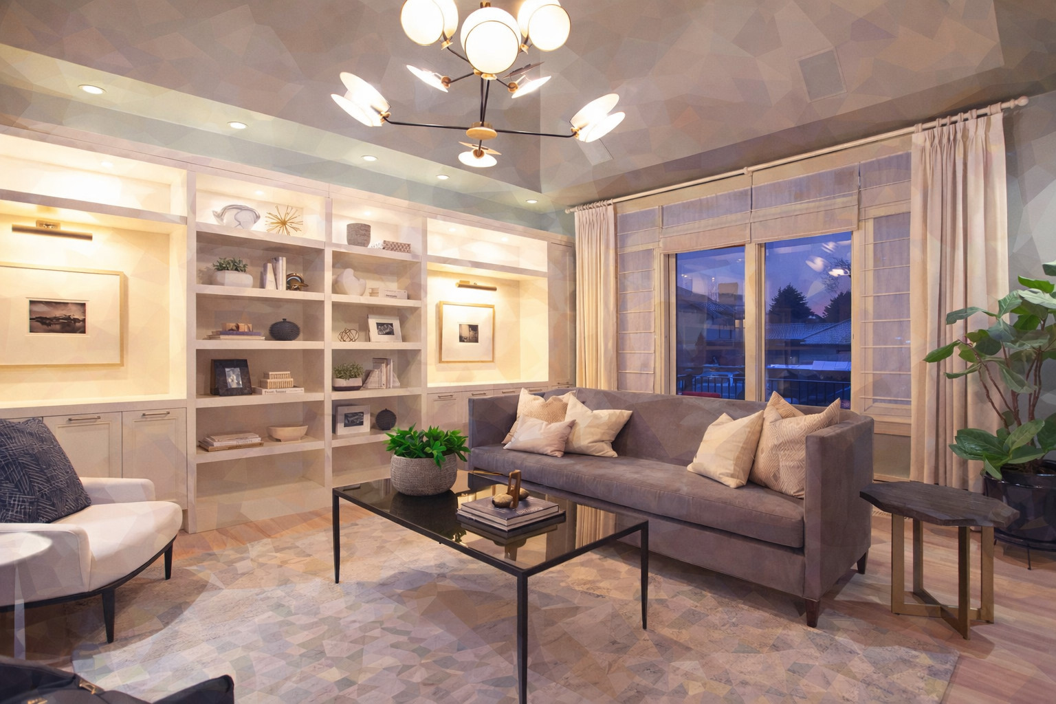The living spaces unfold with intentional grace. Custom built-ins frame the room with precision, their illuminated shelving creating a warm glow that invites contemplation. Each detail—from the sculptural chandelier to the carefully curated furnishings—speaks to a life lived with discernment.